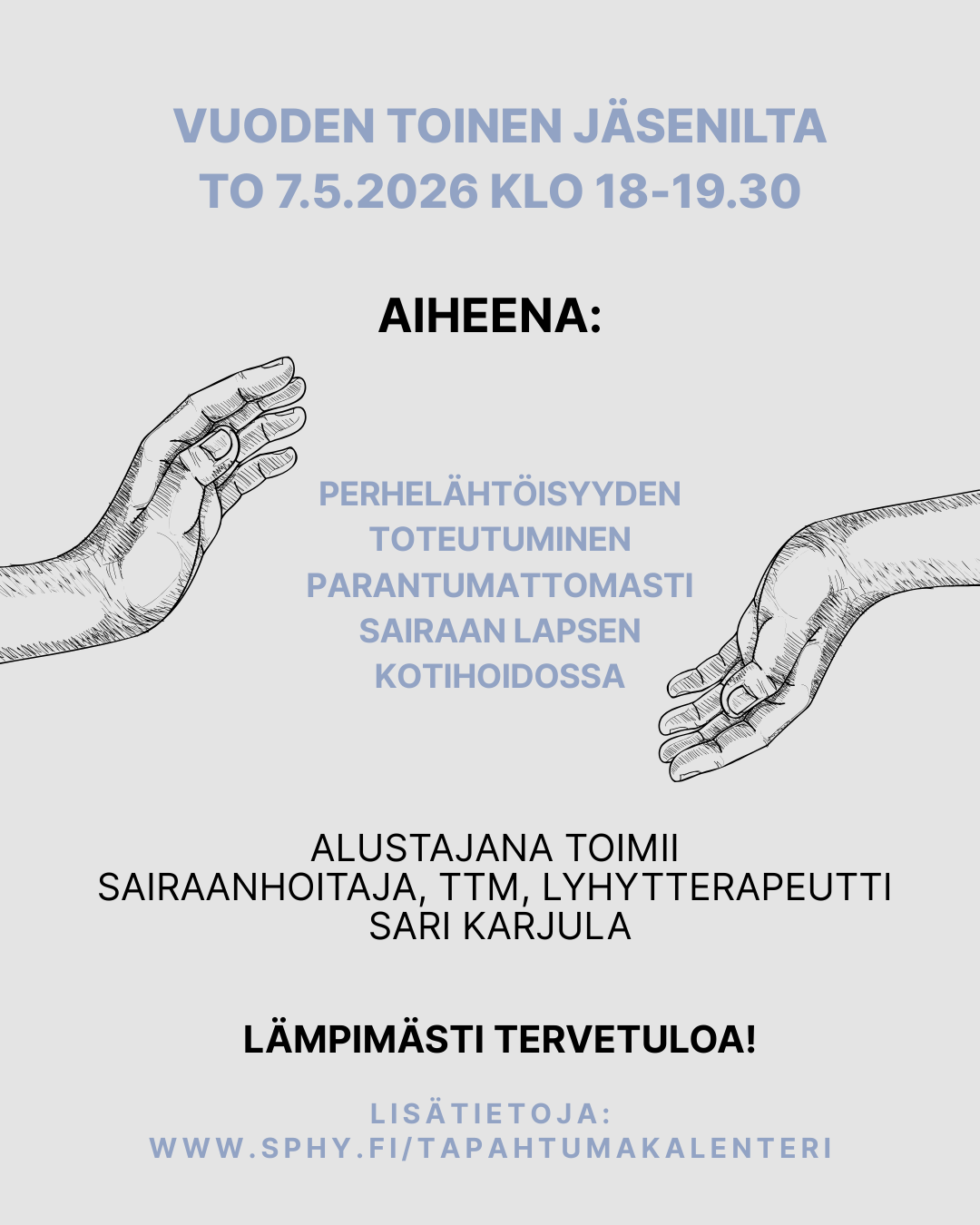 Tervetuloa vuoden 2026 toiseen jäseniltaan! Jäsenillan aiheena on Perhelähtöisyyden toteutuminen parantumattomasti sairaan lapsen kotihoidossa, jonka äärelle meidät johdattelee sairaanhoitaja, TtM,…