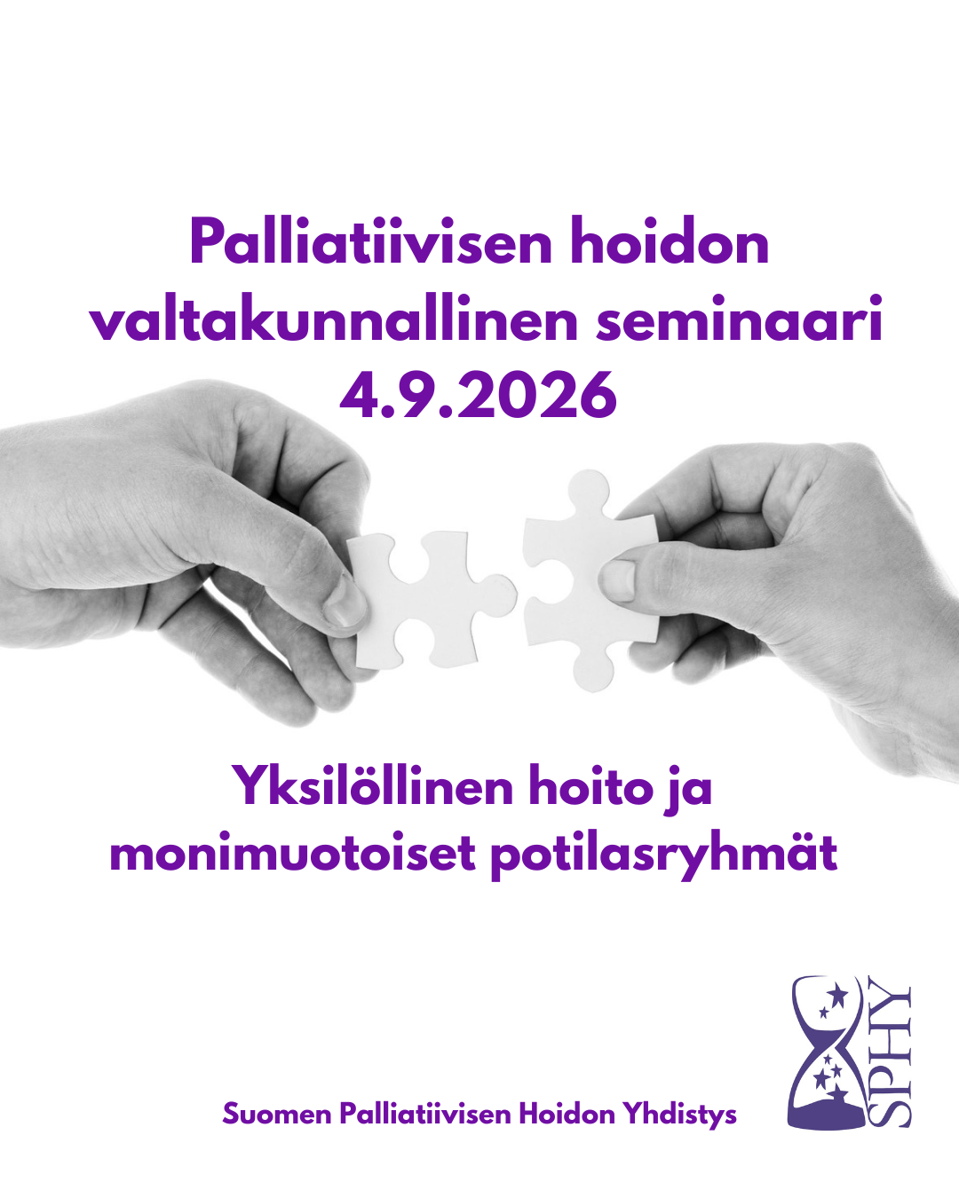 Suomen Palliatiivisen Hoidon Yhdistys järjestää vuosittain kiitellyn valtakunnallisen koulutusseminaarin. Ensi vuoden seminaari järjestetään 4.9.2026. Tarkemmat tapahtumatiedot päivittyvät vuodenvaihteen jälkeen.